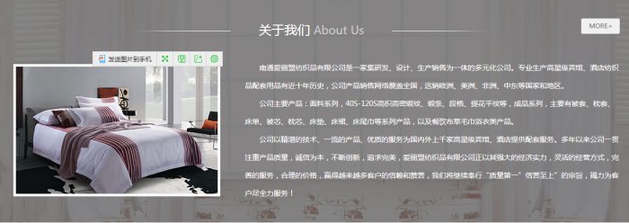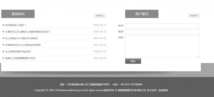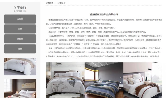 南通愛麗盟紡織品有限公司是一家集研發(fā)、設(shè)計(jì)、生產(chǎn)銷售為一體的多元化公司。專業(yè)生產(chǎn)高星級(jí)賓館、酒店紡織品配套用品有近十年歷史,公司產(chǎn)品銷售網(wǎng)絡(luò)覆蓋全國(guó),遠(yuǎn)銷歐洲、美洲、非洲、中東等國(guó)家和地區(qū)。公司主要產(chǎn)品:面料系列,40S-120S高織高密緞紋、緞條、段格、提花平紋等,成品系列,主要有被套、枕套、床單、被芯、枕芯、床墊、床裙、床尾巾等系列產(chǎn)品,以及餐飲布草毛巾浴衣類產(chǎn)品。