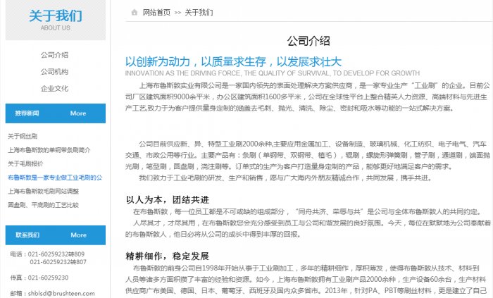 上海布魯斯敦實業(yè)有限公司是一家國內領先的表面處理解決方案供應商,是一家專業(yè)生產“工業(yè)刷”的企業(yè)。目前公司廠區(qū)建筑面積9000余平米,辦公區(qū)建筑面積1600多平米,公司在全球性平臺上整合精英人力資源、高端材料與先進生產工藝,致力于為客戶提供量身定制的涵蓋去毛刺、拋光、清洗、除塵、密封和吸水等功能的一站式解決方案。公司目前供應新、異、特型工業(yè)刷2000余種,主要應用金屬加工、設備制造、玻璃機械、化工紡織、電子電氣、汽車交通、市政公用等行業(yè)。主要產品有:條刷(單鋼帶、雙鋼帶、植毛),輥刷,螺旋形彈簧刷,管子刷,通道刷,端面拋光刷,筆型刷,圓盤刷,澆注刷等。訂單式的生產為客戶打造量身定制的產品,能夠更好地滿足客戶的需求。