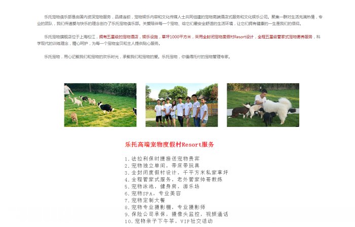 樂托寵物俱樂部是由國內(nèi)資深寵物服務(wù),品牌連鎖,寵物娛樂內(nèi)容和文化傳媒人士共同組建的寵物高端酒店式服務(wù)和文化娛樂公司。聚集一群對生活充滿熱情,專業(yè)的團隊,我們傳遞愛與快樂的理念創(chuàng)辦了樂托寵物俱樂部。關(guān)愛陪伴每一個寵物、給它們最安全舒適的生活環(huán)境,讓它們擁有健康的一生是我們的信仰。
