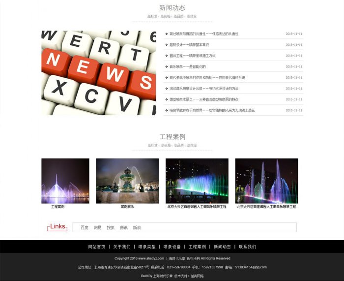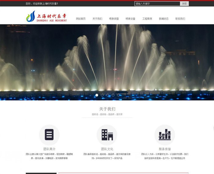 網(wǎng)站描述:首頁采用企業(yè)型網(wǎng)站排版方式,以簡潔化排版方式,突顯公司實力,以實際案例展示,表明公司業(yè)務(wù)范圍。首頁包含版塊有關(guān)于我們版塊,產(chǎn)品中心版塊,噴泉知識版塊,噴泉設(shè)備版塊,新聞動態(tài)版塊,工程案例版塊。