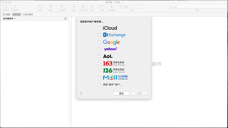 上圖中勾選最后一個‘其他郵件帳戶’選項,點擊“繼續(xù)”按鈕。