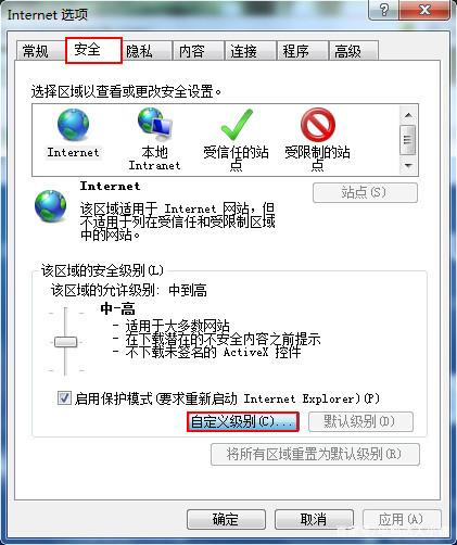2、點擊“安全”選項卡,選擇“自定義級別”,如下圖所示: