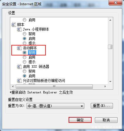 3、找到“活動腳本”設(shè)置項,將其更改成“禁用”,選擇“確定”按鈕,如下圖所示: