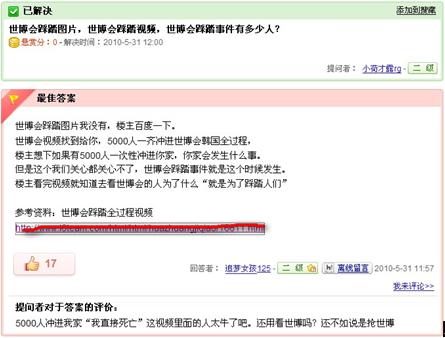 這里,我想說(shuō)是如何在百度知道中借助熱門(mén)事件來(lái)推廣自己的網(wǎng)站。我也是今天在群里聽(tīng)到大家說(shuō)起這個(gè)話題的,當(dāng)時(shí)群里面中所紛紜,于是我就想到在網(wǎng)上搜索下相關(guān)信息,了解下具體情況,在百度上輸入“世博會(huì)踩踏事件”,結(jié)果出來(lái)的第一條是百度知道里面的一個(gè)相關(guān)問(wèn)題,點(diǎn)擊去看如圖: