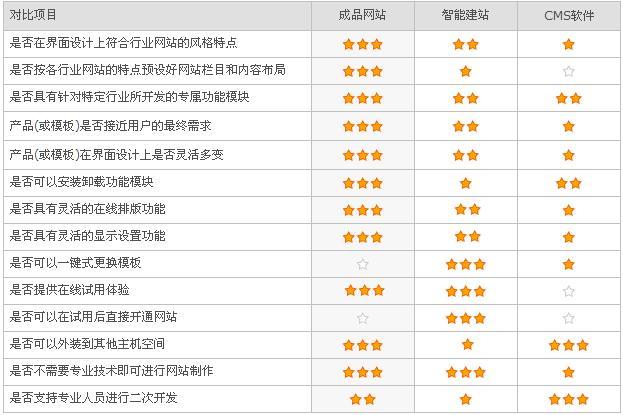 成品網(wǎng)站、智能建站、CMS軟件的區(qū)別對照表: