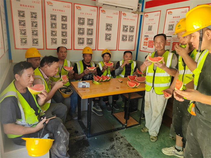 “工友之家”提供的遠不止是一份清涼。在打通服務工友“最后一公里”的道路上,交控建工集團下足了“精細文章”。所有“工友之家”均設在項目核心區(qū)域,每個“工友之家”的墻上,都醒目地張貼著工資維權監(jiān)督二維碼、項目進度表和安全生產規(guī)范?!皰哌@個碼,工資發(fā)了沒、該發(fā)多少,一查就清楚!”在徐淮阜高速房建項目,工長老劉正向新來的工友演示如何使用維權平臺。“工友們,今天我們講講高處作業(yè)的安全要領……”每周三下午,合徐南房建項目的“工友之家”變身“安全課堂”。項目安全員定期在這里開展培訓,讓工友們在休息間隙也能“充電”強能?!耙郧坝幸蓡柌恢勒艺l,現在‘工友之家’就是我們的‘服務站’!”來自四川的電焊工小張感慨道。暢通的溝通渠道和豐富的服務內容,讓“工友之家”不僅是“納涼點”,更成為工友們的“安心島”和“加油站”。目前,交控建工集團“工友之家”已落地23處,累計服務工友近萬人次。
